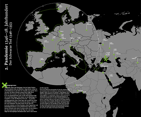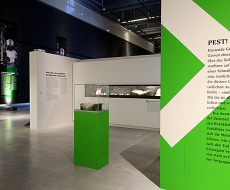 Die Pest hat das gesamte Leben der Menschen verändert und Kulturen, Wirtschaftszweige und Gesellschaftsstrukturen, auch Hierarchien und politische Systeme, beeinflusst. Auf kantig-harten Dreiecksformen zeigen sich diese Auswirkungen auch im Ausstellungsmobiliar. Dabei präsentiert sich das Thema nicht nur in schwarz. Ein fluoreszierendes Grün, von vergrößerten Pestbakterien-Aufnahmen im Fluoreszenzmikroskop, findet sich in der Ausstellung als Schmuckfarbe wieder.